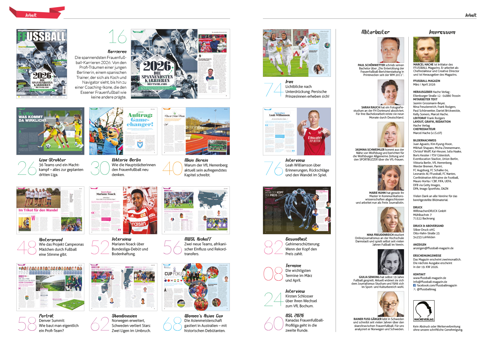 Doch diese Ausgabe erzählt nicht nur von Zahlen. Sie erzählt von Menschen. Von Fritzy Kromp, die Werder Bremen aus dem Dornröschenschlaf geweckt hat – erst Pokal-Finale, jetzt Platz drei, dazu 37.000 Zuschauer im Weserstadion. Von Selina Cerci, die nach zwei Kreuzbandrissen zurückkam und trifft, als hätte es die Pause nie gegeben. Von Mariann Noack, der jungen Verteidigerin aus Berlin, die vor dem Höhenflug mehr Respekt hat als vor jeder Gegenspielerin. Und von Leah Williamson, die uns im Interview daran erinnert, dass der Weg in den Profifußball noch vor wenigen Jahren als „ein bisschen riskant“ galt.