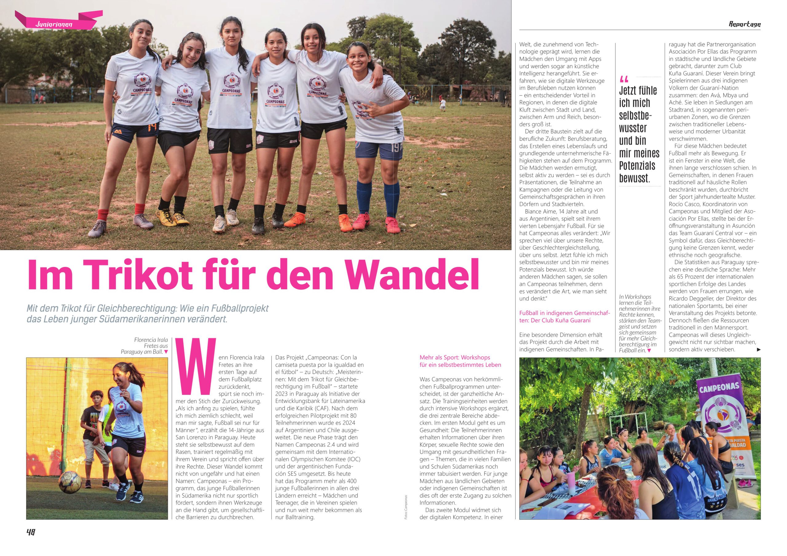 Unser Blick reicht weit über die Grenzen hinaus: Nach Paraguay, wo Mädchen durch Fußball erstmals einen Platz in der Gesellschaft einfordern. In die USA zum neuen NWSL-Franchise aus Denver, das zeigt, wie man ein Profi-Team von Null aufbaut. Und nach Australien, wo der AFC Women‘s Asian Cup Geschichte schreiben will.