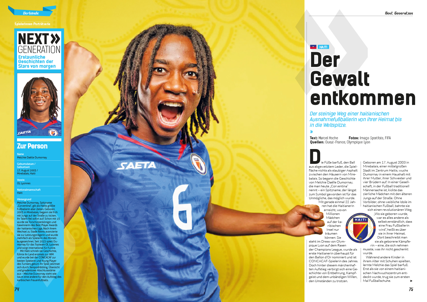 Doch nicht nur auf Vereinsebene gibt es Bemerkenswertes zu berichten. Mit Melchie Dumornay porträtieren wir eine der faszinierendsten Spielerinnen der Gegenwart. Die junge Haitianerin hat einen Weg von den staubigen Straßen von Mirebalais bis nach Lyon zurückgelegt, der seinesgleichen sucht. Ihre Geschichte ist nicht nur eine des sportlichen Erfolgs, sondern auch eine von Überwindung, sozialem Engagement und der Hoffnung für eine ganze Nation.